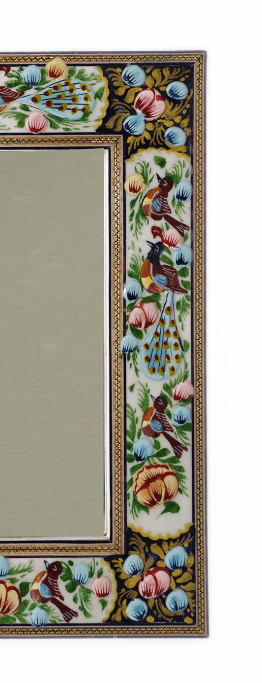 Hand-Painted Mirror with Relief Enamel Frame – Bird & Bloom Design (28×23 cm) Blue Flowers and orange Laleh