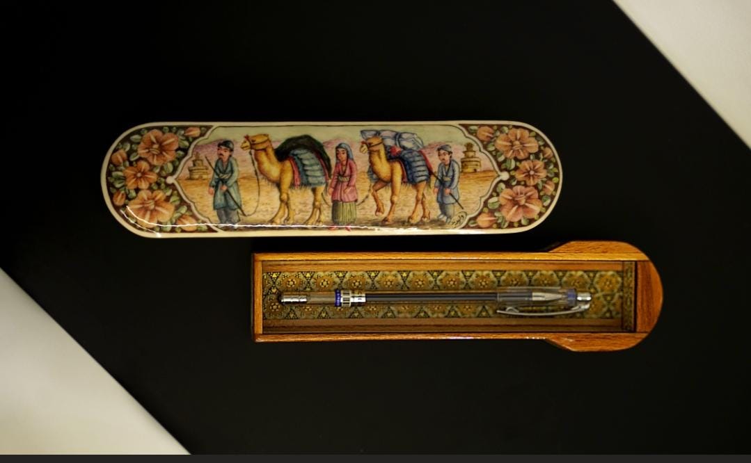 Description: A striking, handcrafted wooden box showcasing a hand-painted caravan scene, meticulously created using the Persian Khatam Kari technique – a traditional marquetry craft blending wood, brass, and bone.